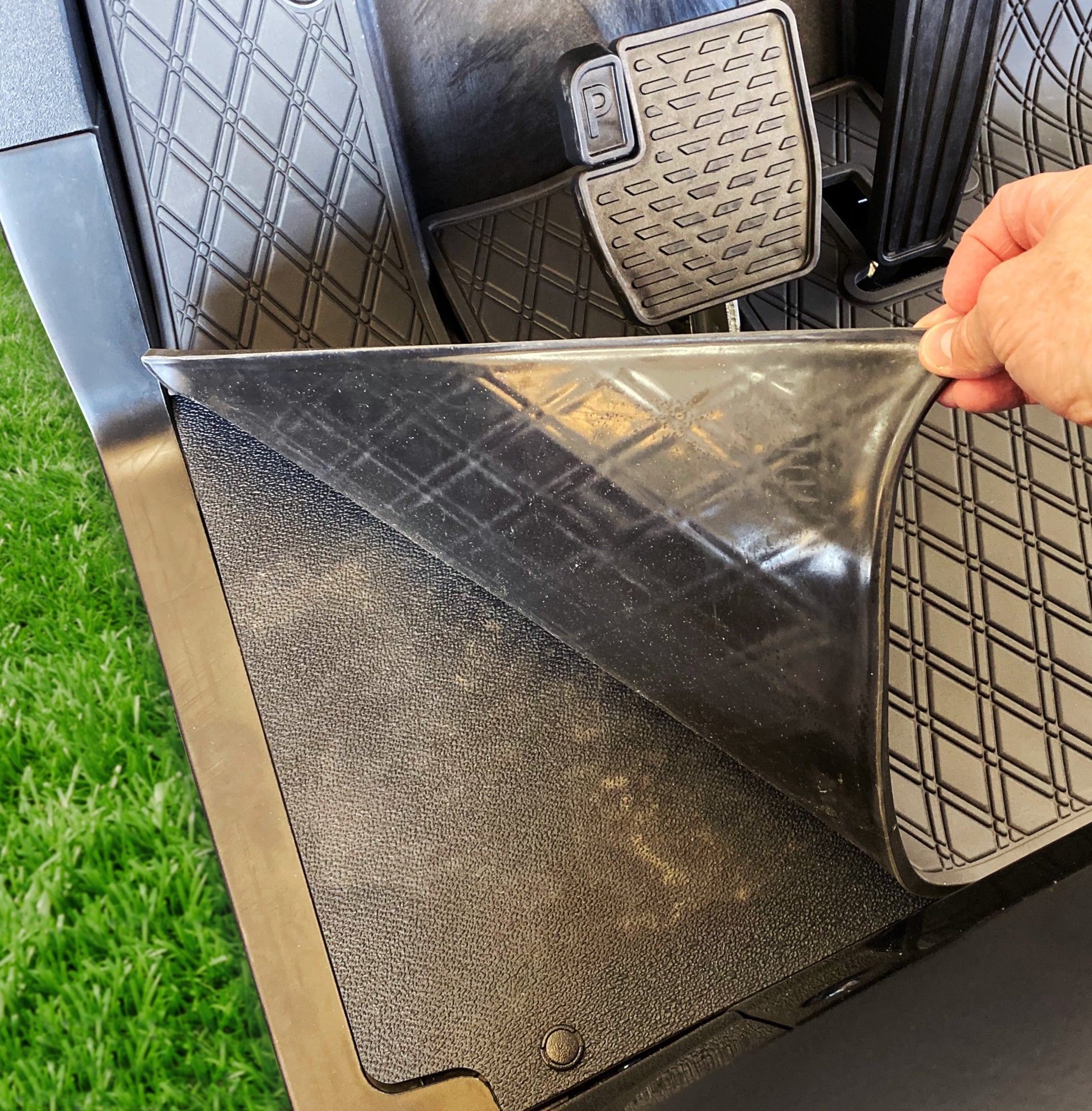 Take the mat out of your golf cart before cleaning. - Use Ammonia-Free Soap